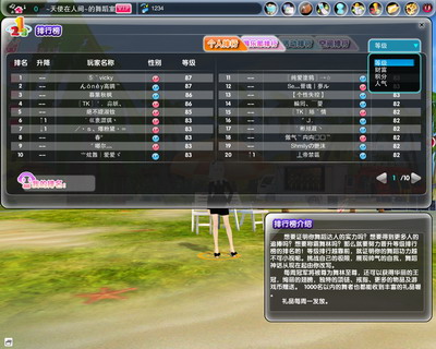 《梦幻舞厅》排行榜目前分为4类:个人排行、俱乐部排行、活动排行和空间排行,而每类排行榜下又有多个排行。例如,个人排行榜就分等级、财富、积分、人气排行;俱乐部排行下分建设度、人数排行。个人排行是玩家展示实力的舞台,排名越靠前,越能证明舞蹈功力不可小视;要登上俱乐部排行榜则需要所有成员的共同努力,想想看,身为一个赫赫有名的俱乐部成员,是多么光荣的事啊!