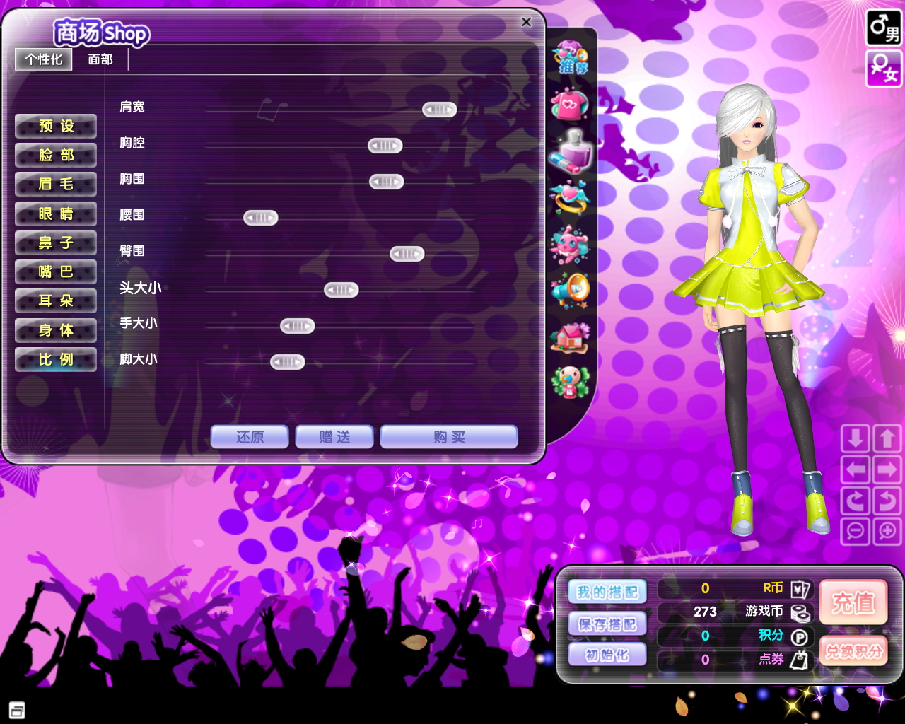 《梦幻舞厅》利用强大的3D引擎制作出功能齐备的化妆系统,支持玩家调整身体的每一个细节,具有无可比拟的真实感。在游戏中你将能够按照自己的心意调整个人形象。不但能自定义身高比例、发型,甚至能描眼线,刷腮红,变幻唇彩、瞳彩等。此时此刻,你会把自己打造成野性动感的蔡依林,俏皮可爱的杨丞琳,还是搞笑帅气的罗志祥,那你可要做好接受众人注目礼的准备哦。