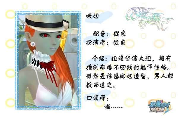 嗷姐:粗线条傻大姐,拥有撞倒南墙不回头的彪悍性格。虽然是性感御姐造型,男人都敬而远之。(良)