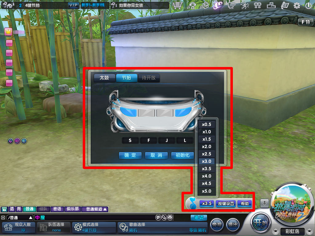 玩家进入游戏房间后,在“模式选择”中的醒目位置即可看到“4键节拍”这四个大字啦!选择好模式咱先别忙着开始,记得先选择适合自己的“音符”移动速度哦,就在屏幕右下角。小编我的体验下来呢,一般是选择3.0,我见过的一些高手呢,一般选择是4左右,当然这些速度还是根据个人习惯去慢慢适应咯。设置完速度,咱们也别忘记再设置自己适应的游戏键位哦,舒适的键位也是圆满打出高分的必备因素呢!