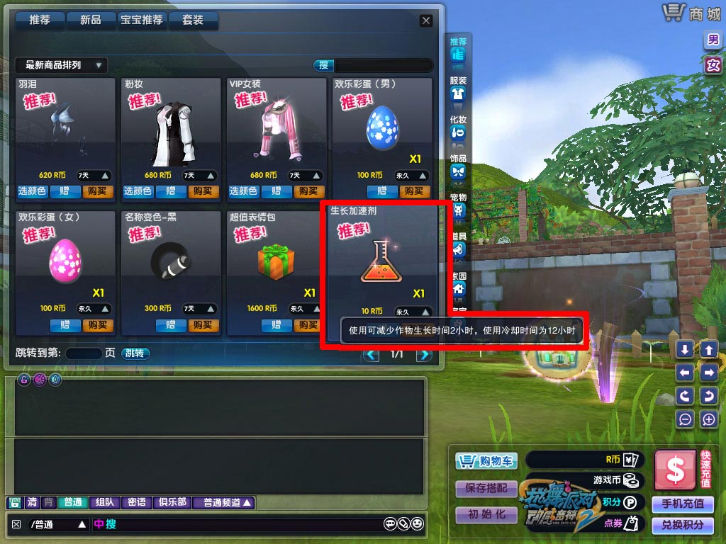 点击《热舞派对Ⅱ》界面上方的商城按钮,即可直接打开最新的商城推荐页面。我们今天的主人公“生长加速剂”就在推荐窗口的右下角哦!商城中的“生长加速剂”都是永久时效,所以不用担心它的保质期问题,请玩家们放心购买哟!加速剂可以使用的范围包括:土地、池塘、牧场和矿井。这些区域种植、生产的物品都可以通过加速剂来提高生产效率呢。