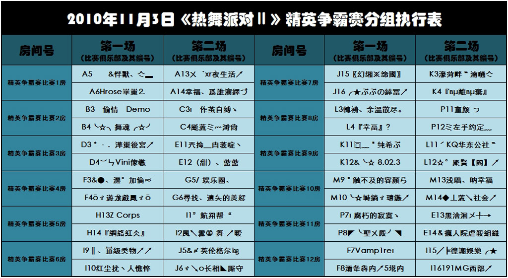 2010年11月3日《热舞派对Ⅱ》精英争霸赛分组执行表