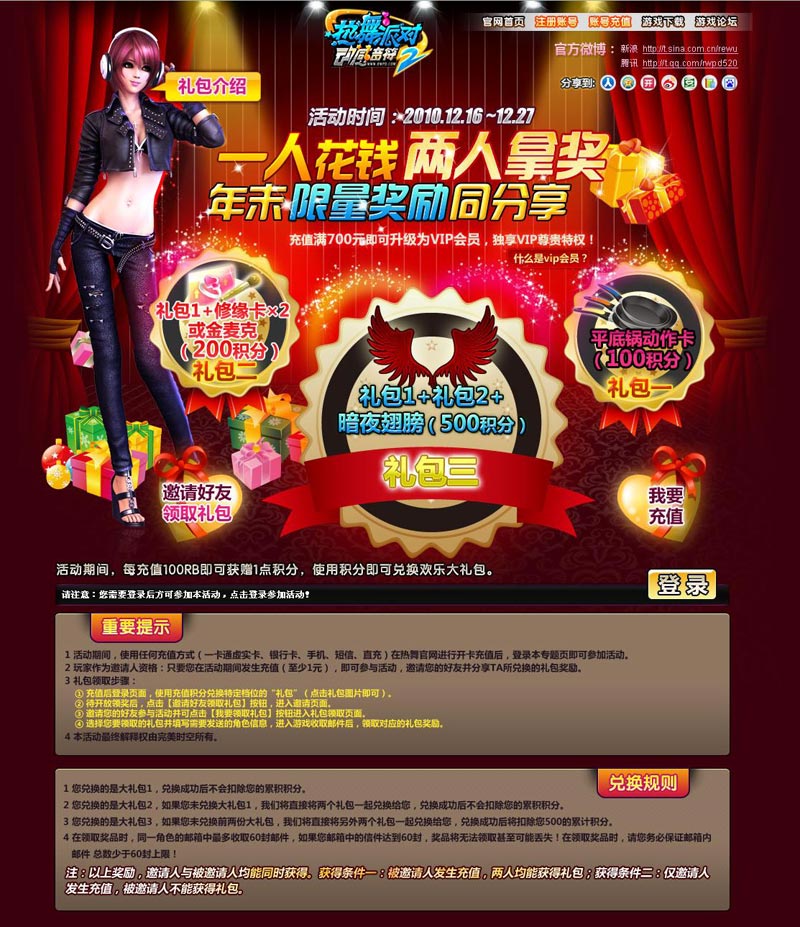 好消息来咯!从明天开始,所有《热舞派对Ⅱ》玩家都可以通过参与“一人花钱两人拿奖”的欢乐回馈活动赢得12月最新的专属炫丽道具哟!本活动将于明日正式开放,所有玩家都可以参与,真正无门槛。同时,现在充值满700元的玩家即可升级为VIP会员,独享VIP尊贵特权!活动期间,玩家每充值100RB即可获赠1点积分,使用积分就可以兑换欢乐大礼包啦。没错,参与活动就是这么简单!还等什么,让我们明天登录抢大礼吧!