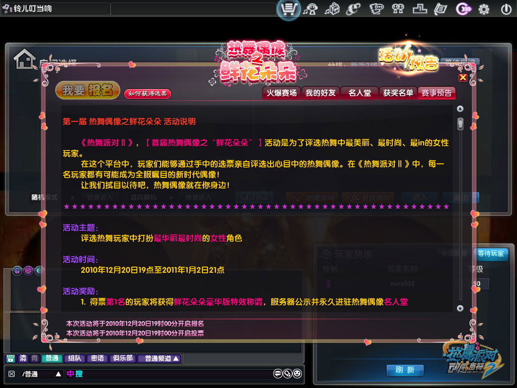 2. 得票第2、3名的玩家将获得鲜花朵朵精致版特效称谓,服务器公示并永久进驻热舞偶像名人堂;
