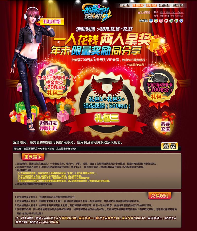 2.玩家作为邀请人资格:只要您在活动期发生充值(至少1元),即可参与活动,邀请您的好友并分享TA所兑换的礼包奖励。
