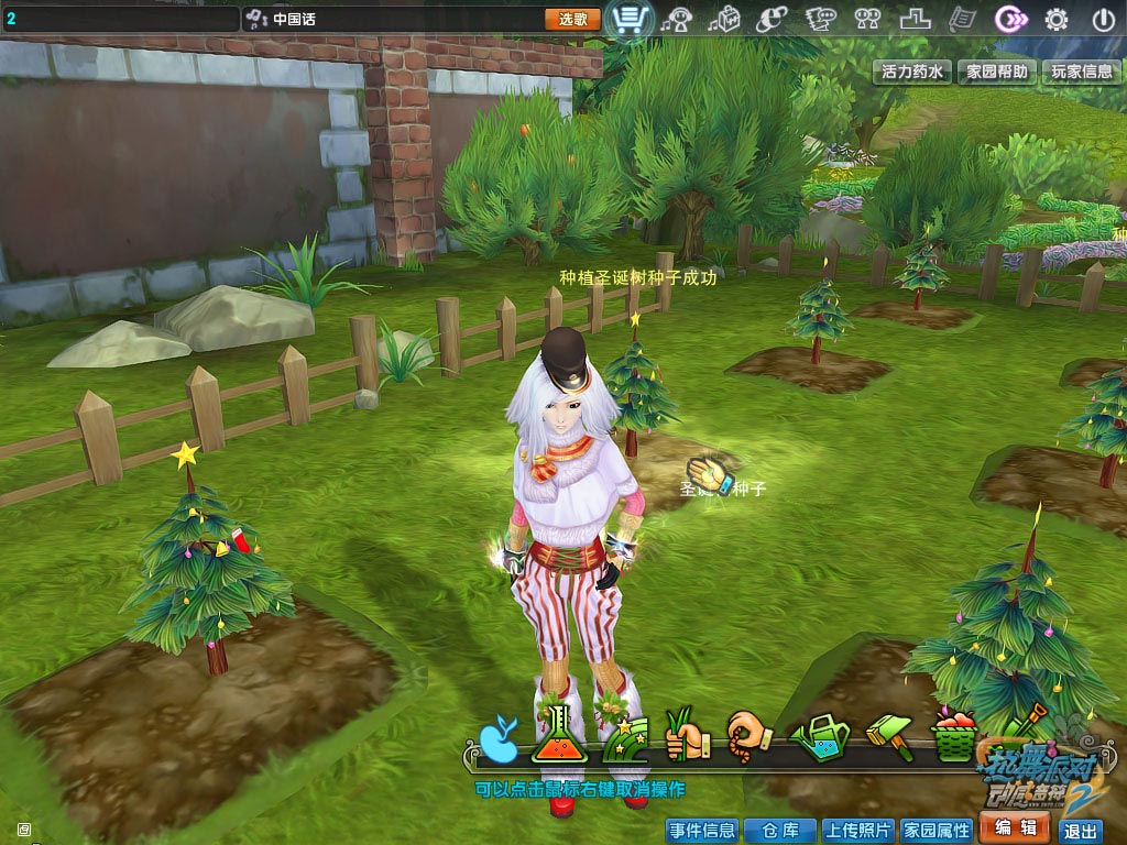 玩家完成任务“圣诞叮叮铛”后,可以获得圣诞特别作物种子“圣诞树种子”,只需将它们种在家园里即可。经过大约12小时之后,玩家就可以收获啦!采集下圣诞树上的“圣诞星光”并集齐一定数量,玩家就可以到家园的消耗品合成处合成一只装有神秘礼物的“圣诞袜子”啦。