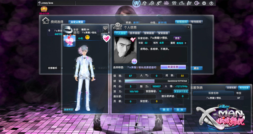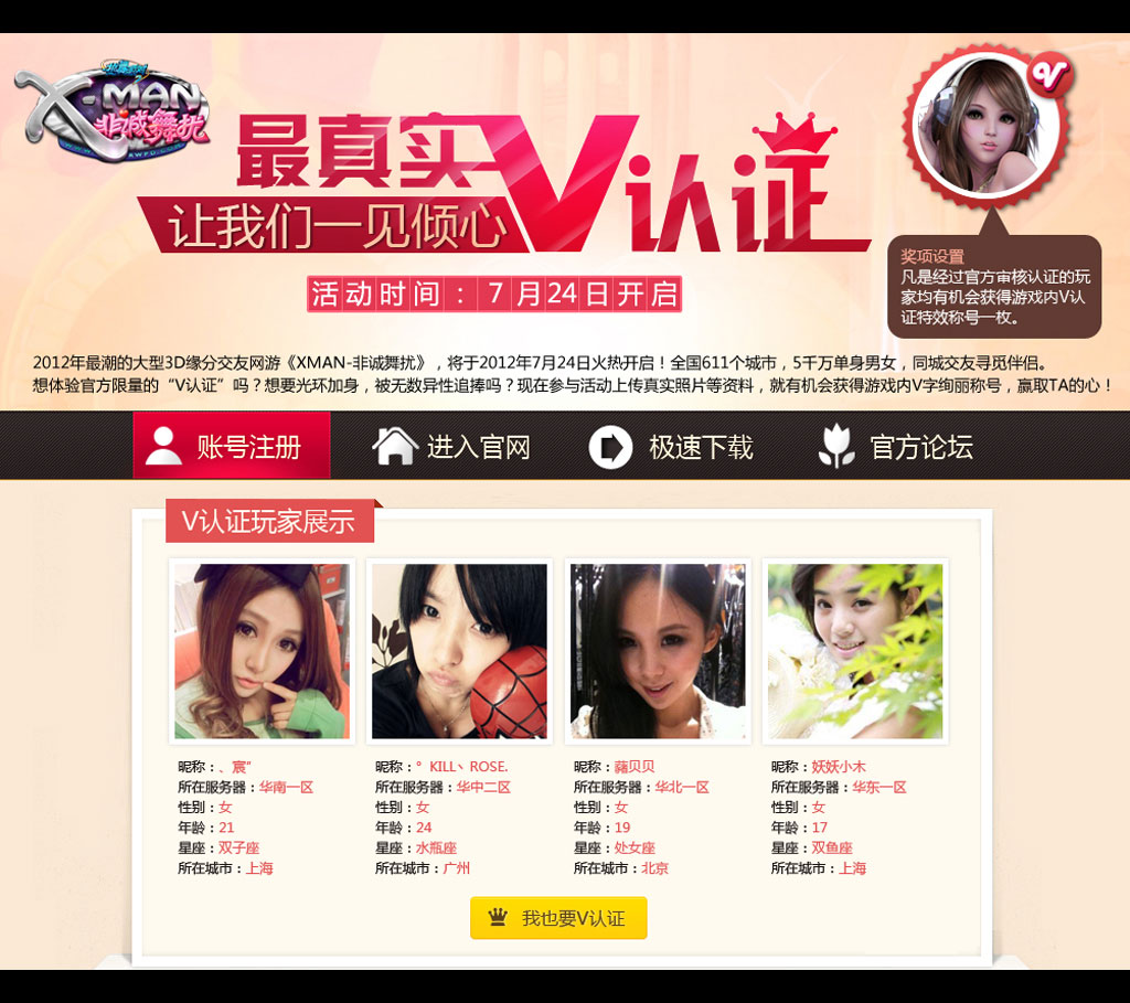 当玩家通过V认证之后,就将在个人信息前前加标V字标示。可不要小瞧这个标示,每个玩家在核实对方资料身份的时候,V字标示将是重要的信息凭证,想被《XMAN-非诚舞扰》通过身份核实么?赶快来参加V认证活动吧!